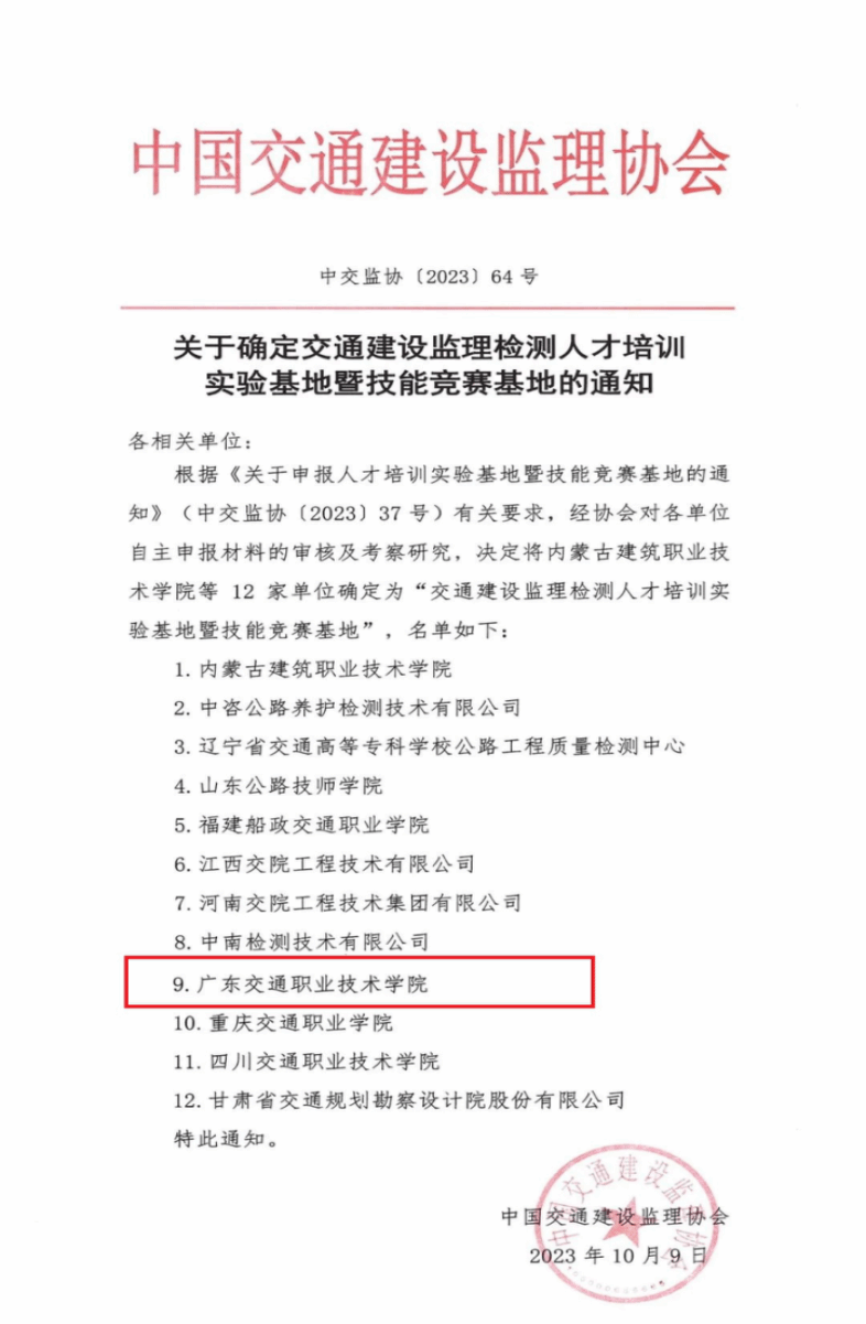 根据中国交通建设监理协会下发的文件《关于确定交通建设监理检测人才培训实验基地暨技能竞赛基地的通知》(中交监协〔2023〕37号)显示,公司成功入选交通建设监理检测人才培训实验基地暨技能竞赛基地名单。
