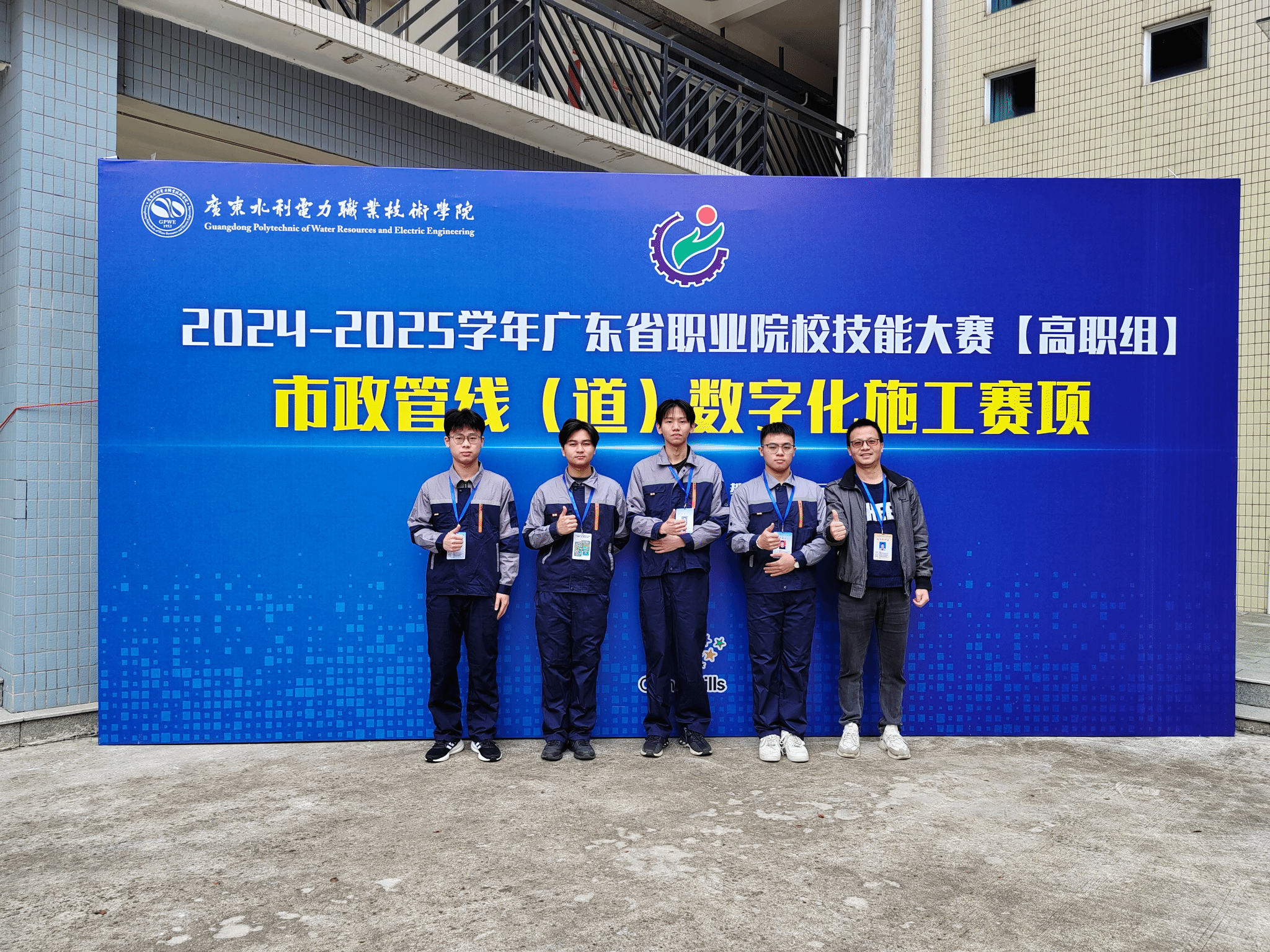 近日,由广东水利电力职业技术公司承办的2024-2025学年广东省职业院校技能大赛(高职组)“市政管线(道)数字化施工”赛项圆满落下帷幕。此次大赛汇聚了全省19所高职院校的优秀队伍,经过激烈的角逐,土木工程公司王景梅、蒋英礼老师指导的吕田炜、沈志豪、廖俊烨、刘程艺等4位同学组成的参赛队伍脱颖而出,荣获二等奖。
