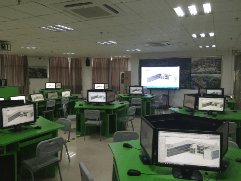 基于云计算的BIM采集、三维建模仿真施工实训室,通过配置57台高性能的电脑工作站、一台测程达几十米、可进行点云处理的三维激光扫描仪、3D打印机、BIM平台软件、建筑施工仿真实训软件、建筑施工管理软件、结构设计软件、工程概预算软件、点云处理三维重建软件等软件,组成虚实结合的仿真施工实训室,同时可容纳50余名员工开展专业课程教学、实训和考核。